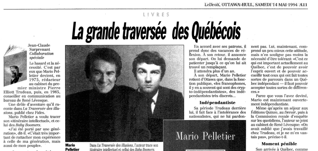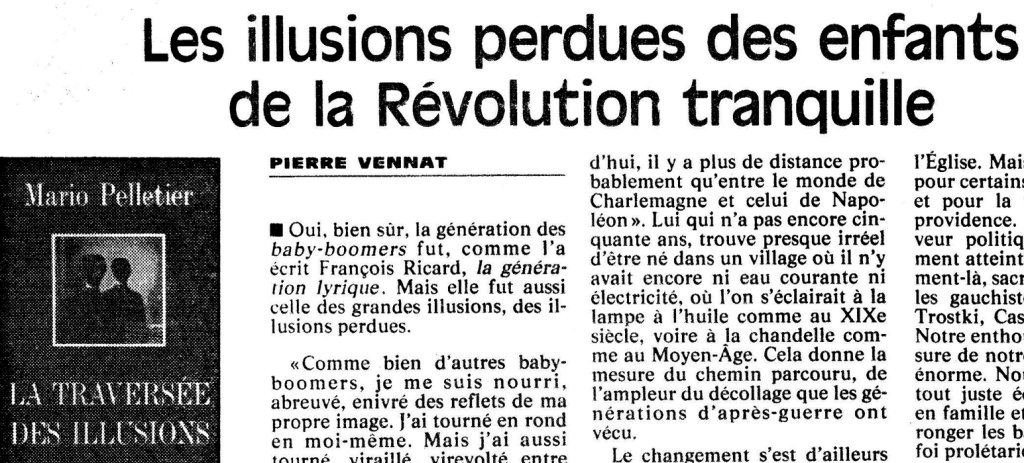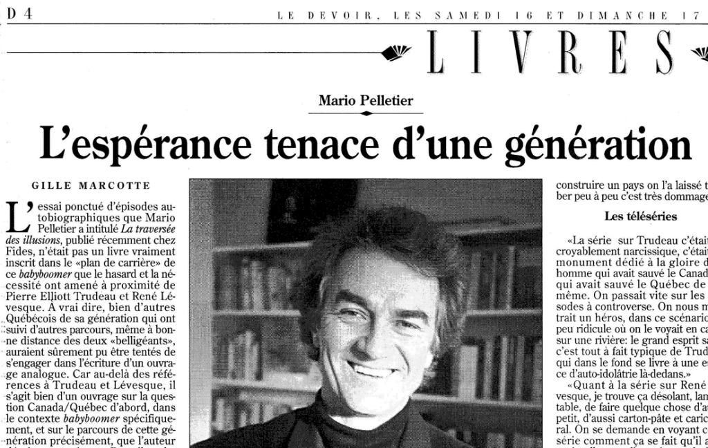 « La traversée des illusions, c’est un survol de tout ce qui s’est passé dans le monde, au Canada, au Québec, pendant les trente dernières années. M. Pelletier n’a rien oublié. Tous les événements importants et quelquefois triviaux revivent au bon moment et avec bonheur. L’atmosphère de la Révolution tranquille est particulièrement bien rendue. On oublie tellement vite ! Il faut des gens comme Mario Pelletier pour nous permettre de revenir sur nos pas et repenser à nos réussites comme à nos défaites. »