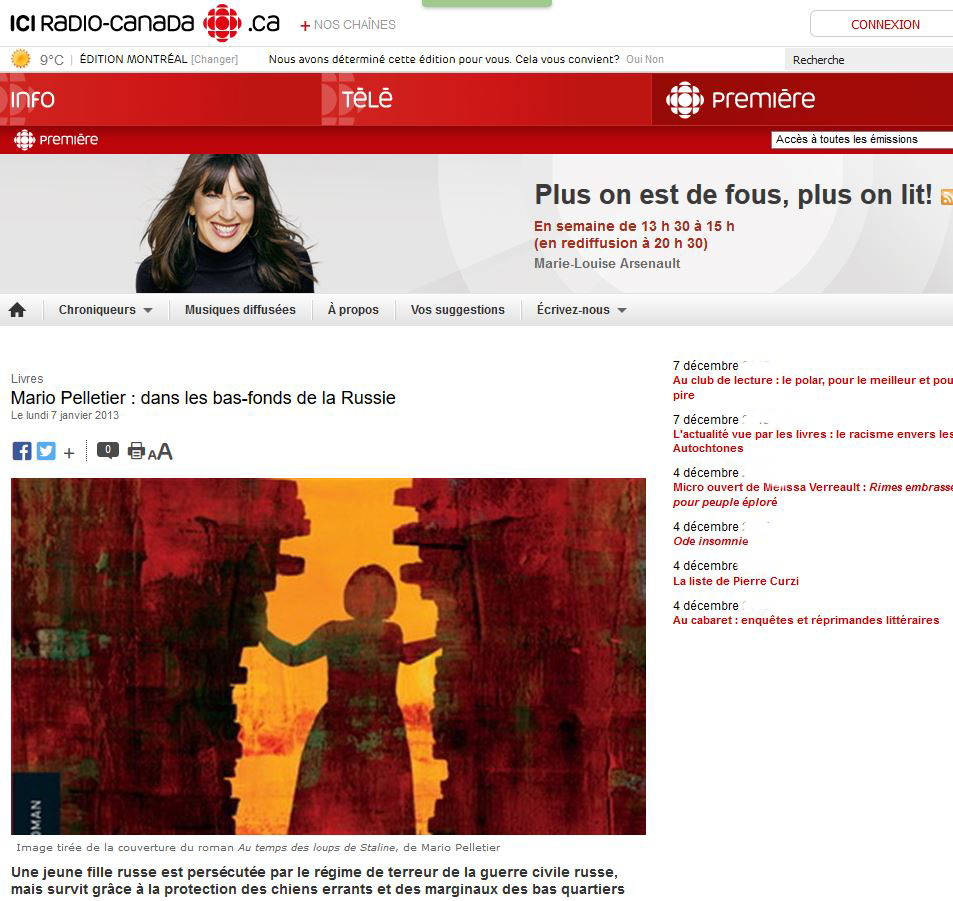 « Un roman bouleversant sur la Révolution russe vécue de l’intérieur… Au temps des loups de Staline raconte une aventure peu commune. .. De ce récit épique, outre le destin incroyable de Vera et de ses camarades russes, on retiendra les atmosphères et les scènes d’époque que Mario Pelletier excelle à recréer. »