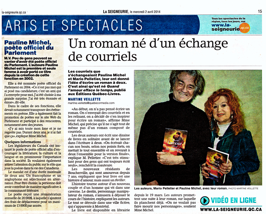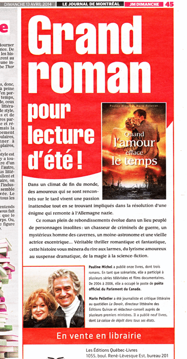 « Un livre qui respire l’amour et le romantisme… Et qui se lit tellement bien, dès le départ, avec la comète qui arrive et effraye tout le monde… Une très belle écriture, bravo ! » (Diane Lafrance, TVGL, 25 avril 2014)