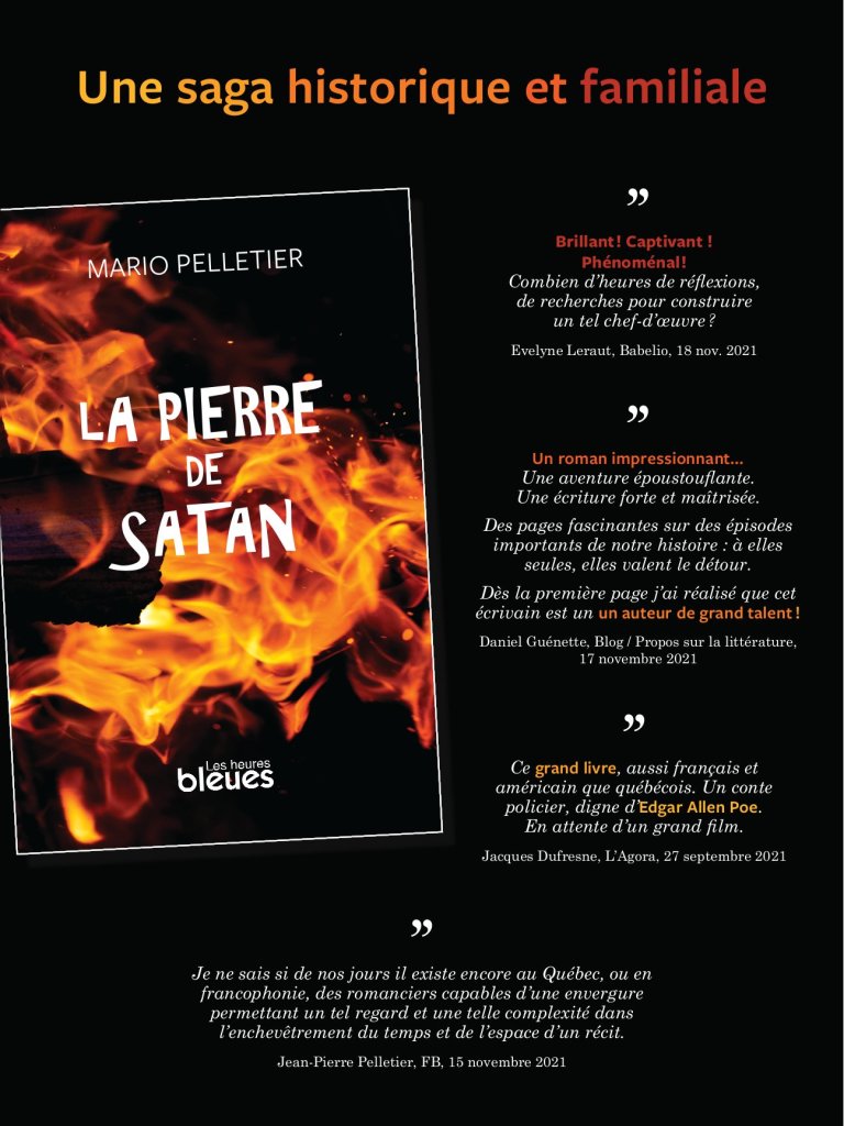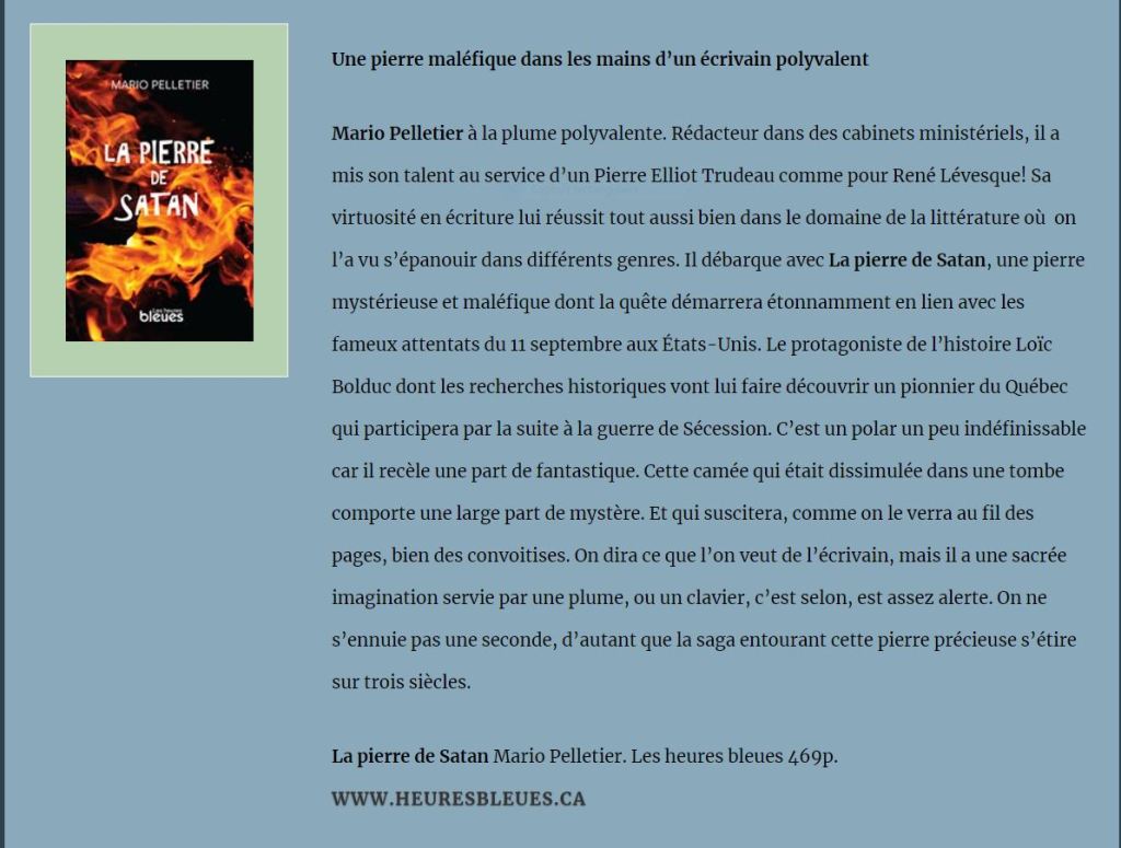 Mario Pelletier à la plume polyvalente… Sa virtuosité en écriture lui réussit tout aussi bien dans le domaine de la littérature où on l’a vu s’épanouir dans différents genres… Il débarque avec La pierre de Satan, une pierre mystérieuse et maléfique… une sacrée imagination, servie par une plume alerte… On ne s’ennuie pas une seconde, d’autant que la saga entourant cette pierre précieuse s’étire sur trois siècles.