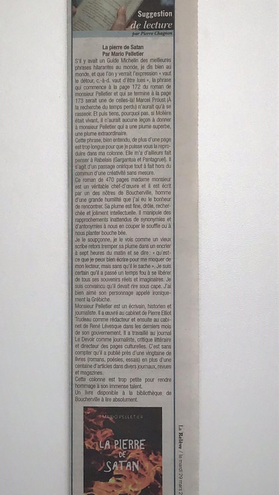 Ce roman de 470 pages est un véritable chef-d’œuvre… Monsieur Pelletier a une plume superbe, une plume extraordinaire… fine, drôle, recherchée et joliment intellectuelle. Il manipule des rapprochements inattendus de synonymies et d’antonymies à nous en couper le souffle… Cette colonne est trop petite pour rendre hommage à son immense talent. À lire absolument.