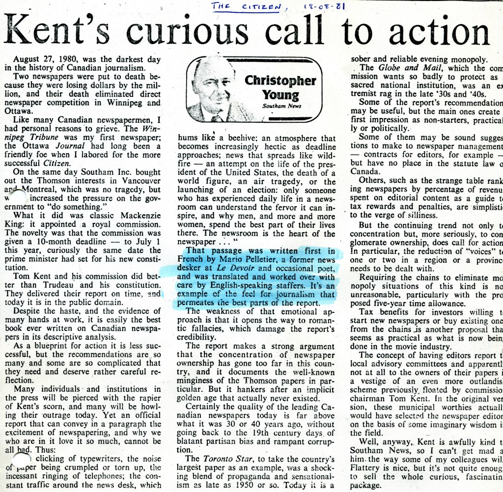 « Ce passage a été écrit d’abord en français par Mario Pelletier, journaliste au bureau de la rédaction du Devoir et poète à ses heures… C’est un exemple de la sensibilité au journalisme qui ressort des meilleurs passage du rapport de la Commission. » (Christopher Young, Le Citizen, 19 août 1981)