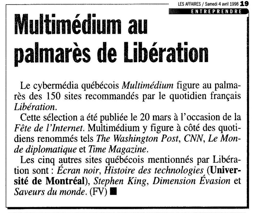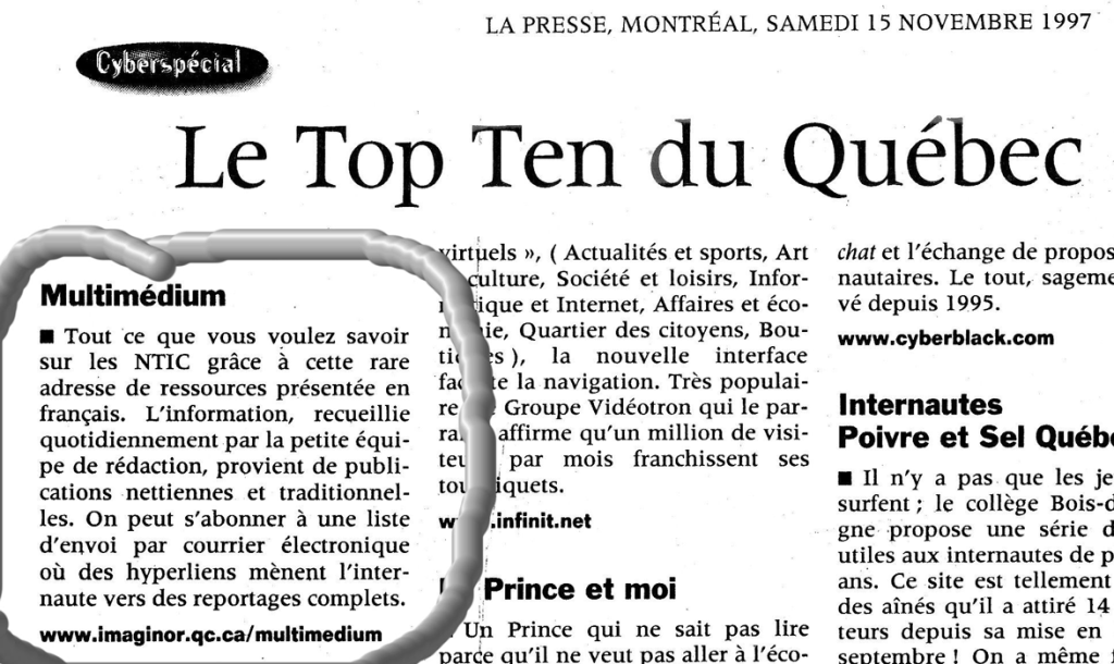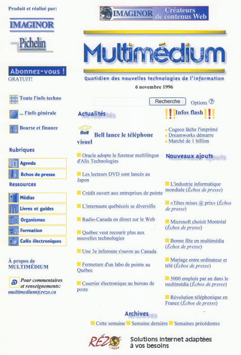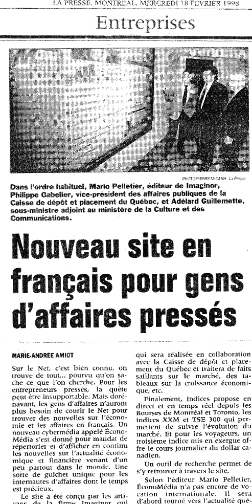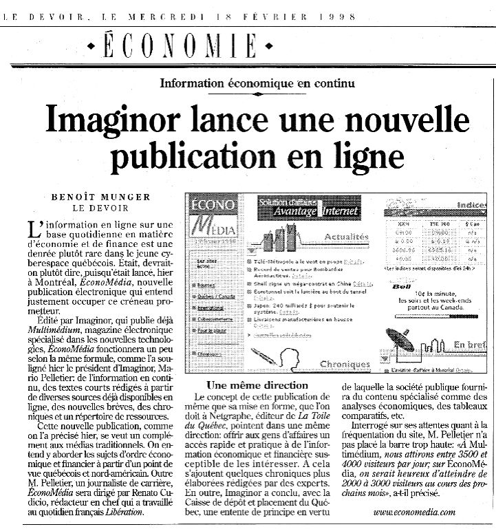 Édité par Imaginor, qui publie déjà Multimédium, magazine électronique spécialisé dans les nouvelles technologies, ÉconoMédia fonctionnera un peu selon la même formule, comme l’a souligné hier le président d’Imaginor, Mario Pelletier ; de l’information en continu, des textes courts rédigés à partir de diverses sources déjà disponibles en ligne, des nouvelles brèves, des chroniques et un répertoire de ressources. (Le Devoir, 18 février 1998)