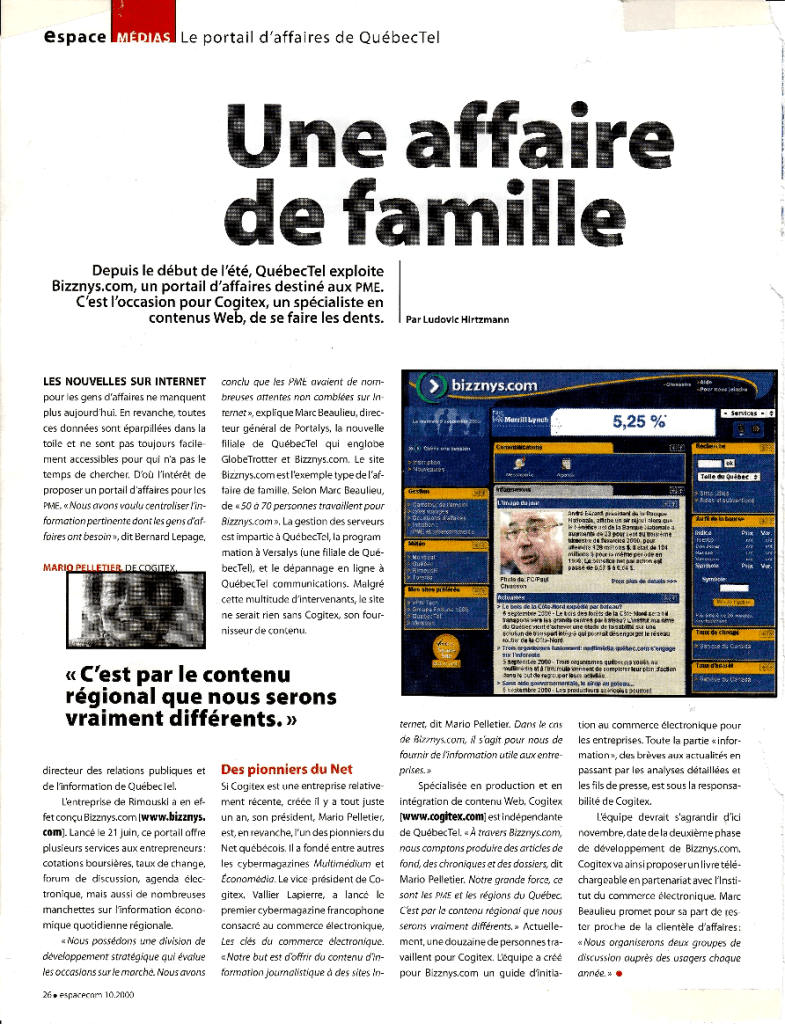 C’est l’occasion pour Cogitex, un spécialiste en contenus Web, de se faire les dents. (…) Si Cogitex est une entreprise relativement récente, créée il y a tout juste un an, son président, Mario Pelletier, est, en revanche, l’un des pionniers du Net québécois. Il a fondé entre autres les cybermagazines Multimédium et ÉconoMédia. (Magazine EspaceCom, Montréal, septembre 2000)