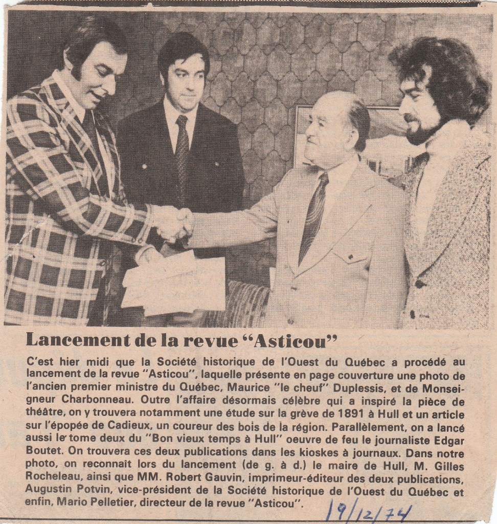 DIRECTEUR DE LA REVUE ASTICOU, organe de la Société historique de l’Ouest du Québec, Hull, 1973-1975