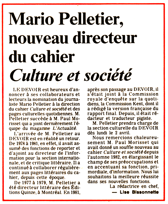 The clicking of typewriters, the noise of papers crumpled or torn up, the incessant ringing of telephones; the constant trafic around the news desk, which hums like a beehive; an atmosphere that becomes increasingly hectic as deadline approaches… That passage was written first in French by Mario Pelletier, a former news desker at Le Devoir and occasional poet… It’s an example of the feel for journalism that permeates the best part of the report. (Christopher Young, The Citizen, 19 août 1981)