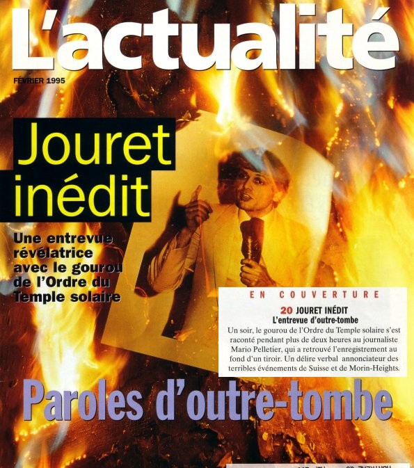 Je l’entends dire que « nous sommes à un point de non-retour » et que « le monde va périr par le feu ». J’écoute de nouveau la cassette : c’est Luc Jouret, sa voix, son ton prédicant, et c’est enregistré là depuis 1984, comme une sombre prophétie, comme un appel prémonitoire des flammes apocalyptiques de Salvan, de Cheiry, de Morin-Heights.